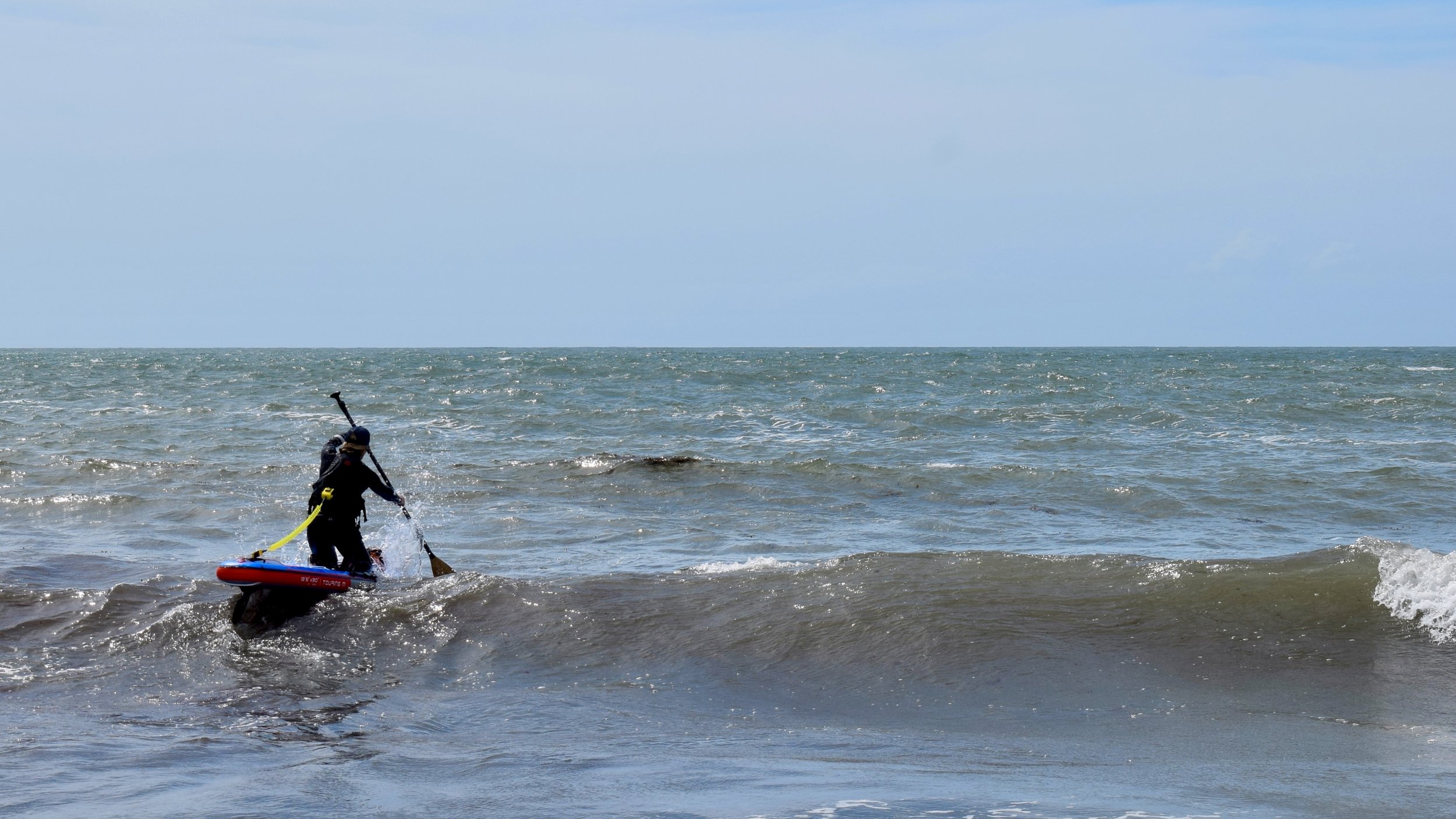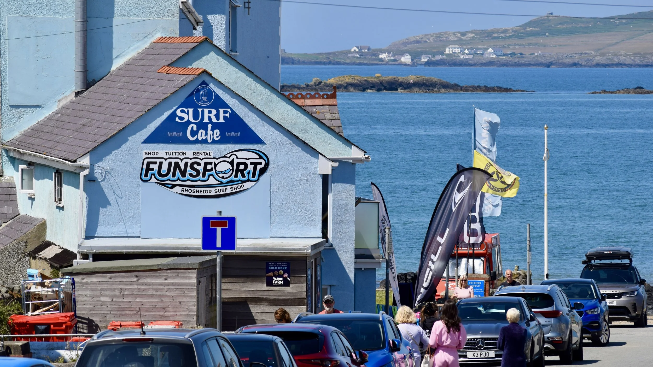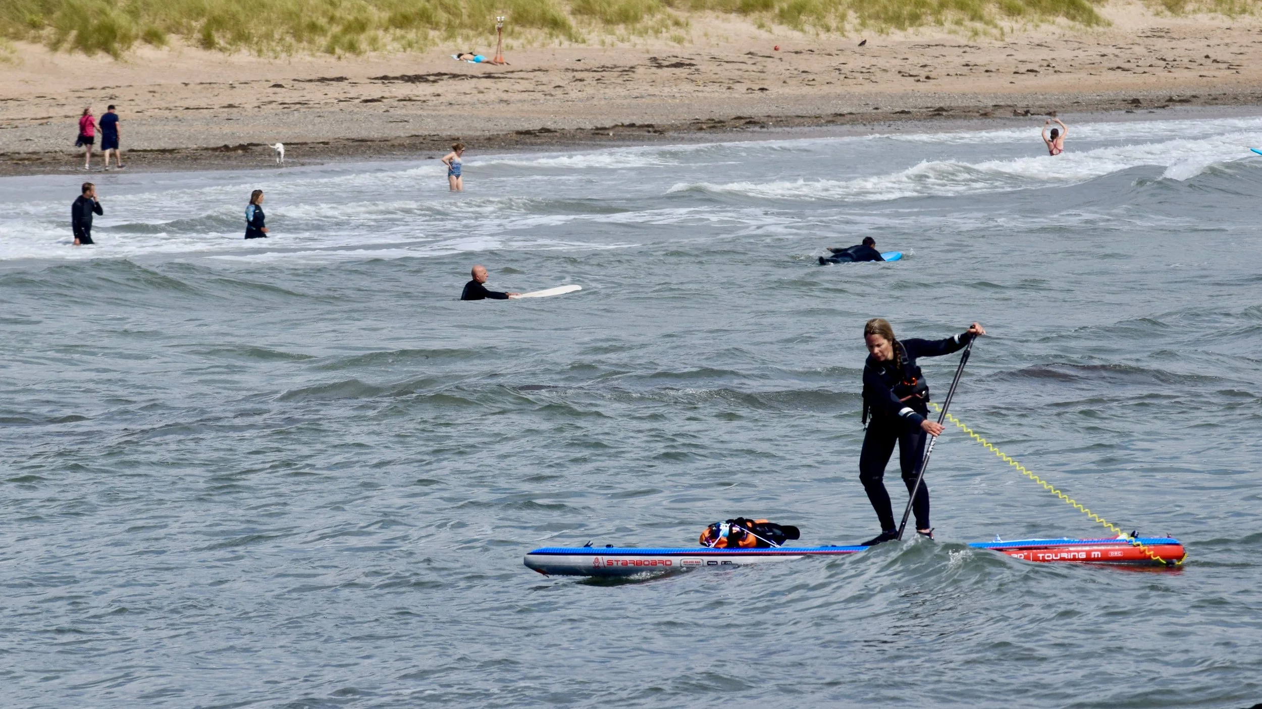 Perhaps my touring SUP was ill-suited to the surf zone? Or maybe the waves were poorly shaped for riding? Who knows - but my skills were definitely not up to the task! Multiple swims later, I arrived spluttering on the beach to see Kelly gracefully ride her chosen wave ashore. I clearly had much to learn - not least that paddling a 13ft SUP back out through breaking waves was also a challenge too far today. Kelly again made light work of the surf zone, while I resorted to a brief ‘walk of shame’ to reach the shallow lagoon at the south side of Rhosneigr’s town beach. Cursing my wilful inflatable craft, I tackled the waves once again, and enjoyed some success in the friendly break that formed in front of Rhosneigr’s surf shop. You’ve got to look good in front of the clubhouse!