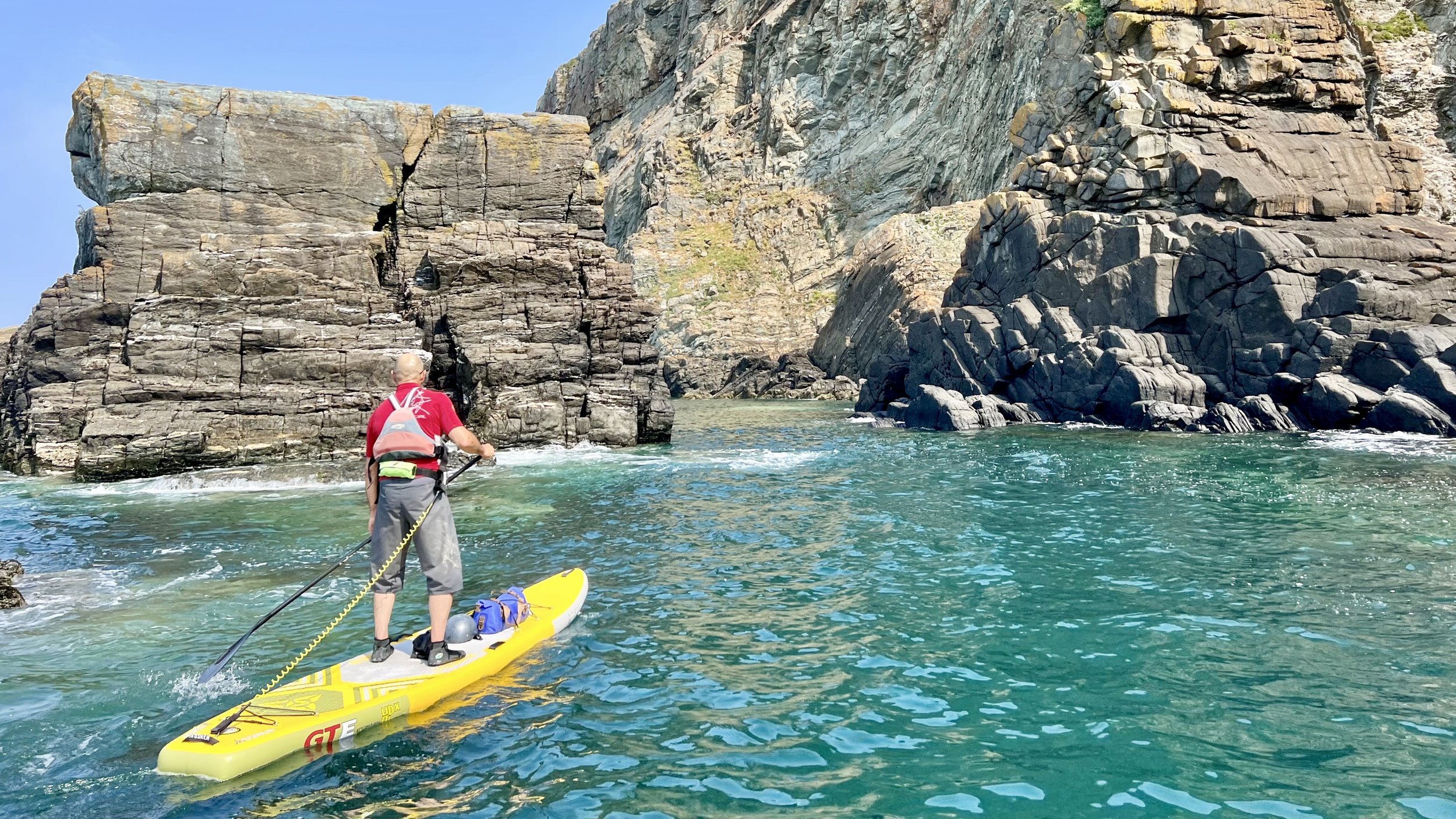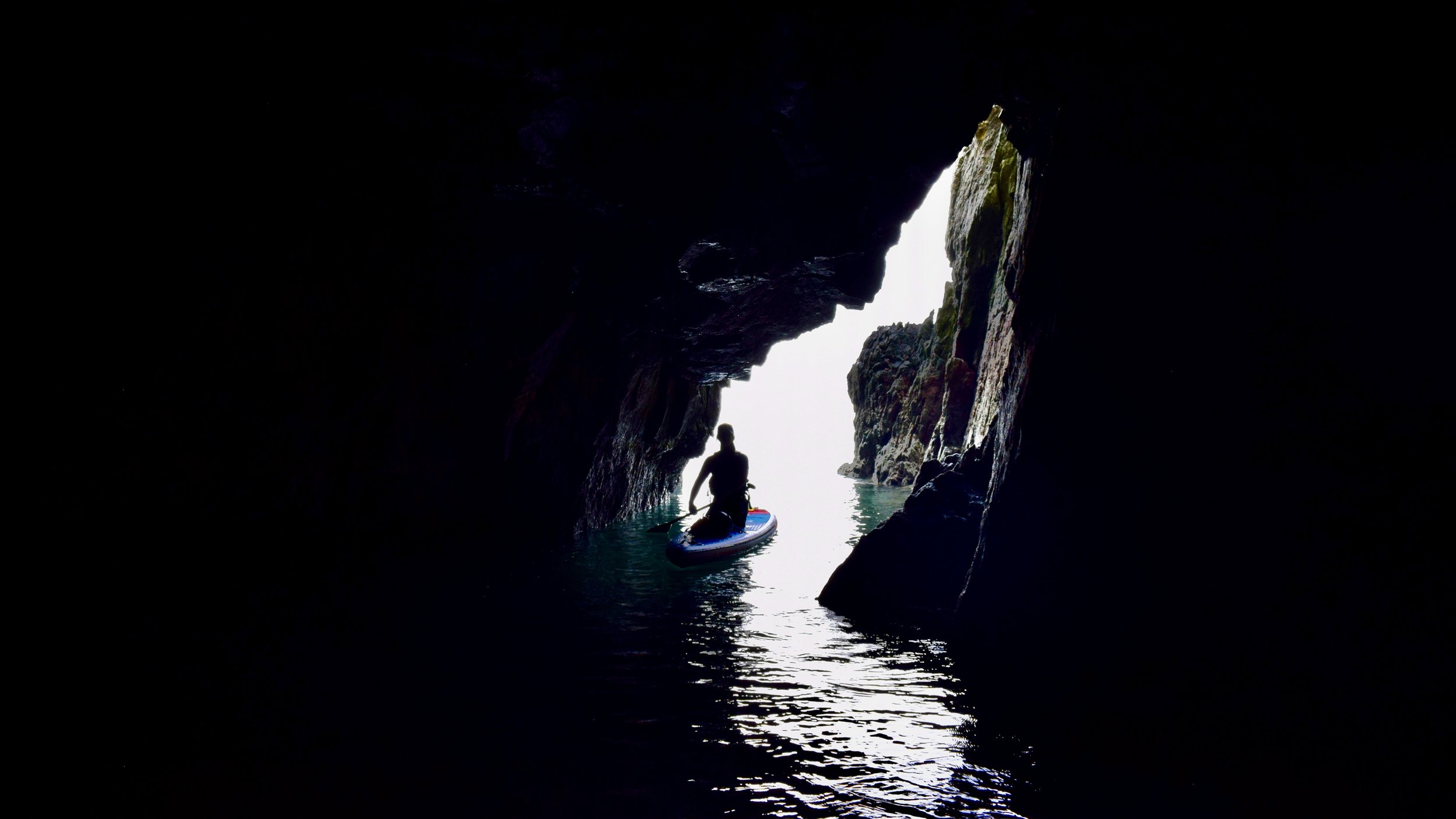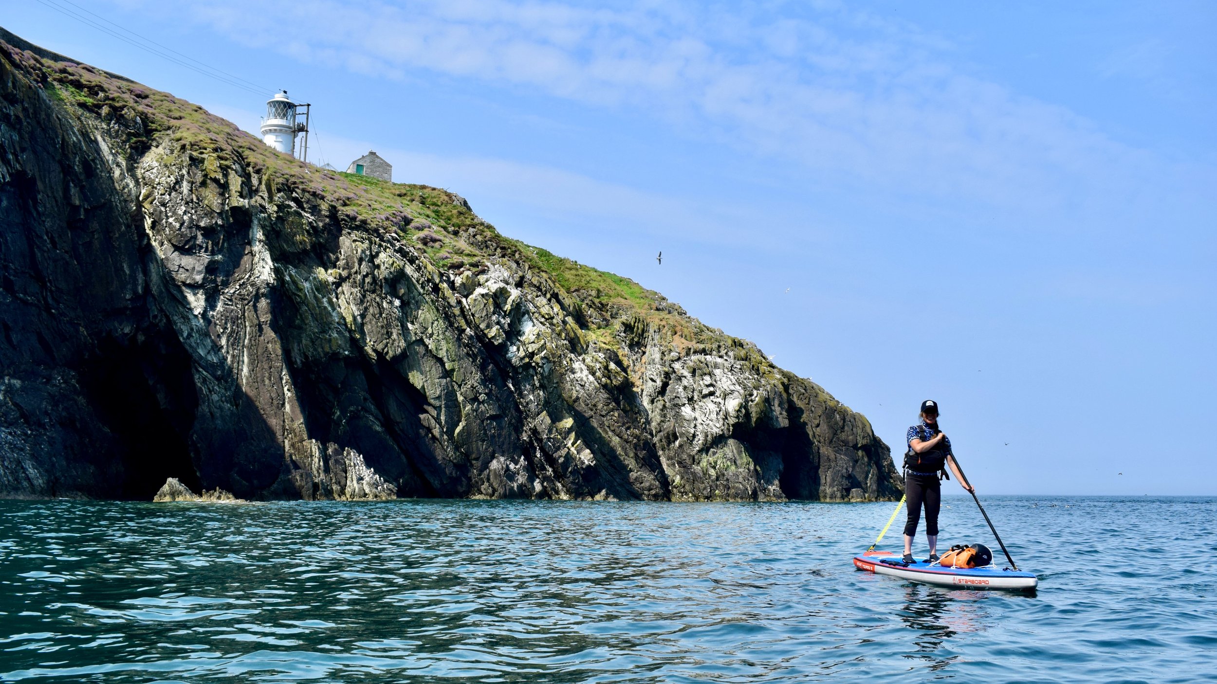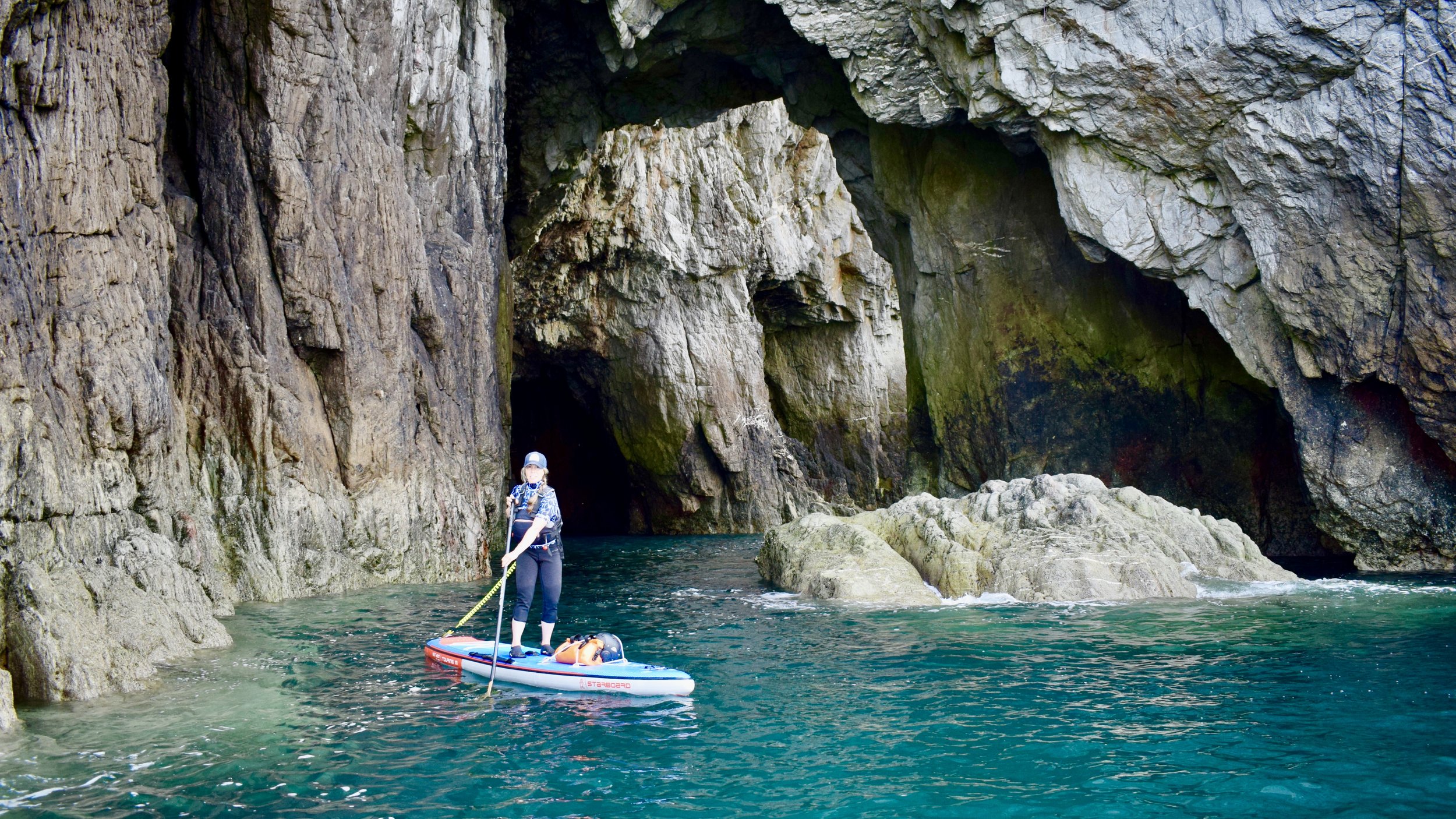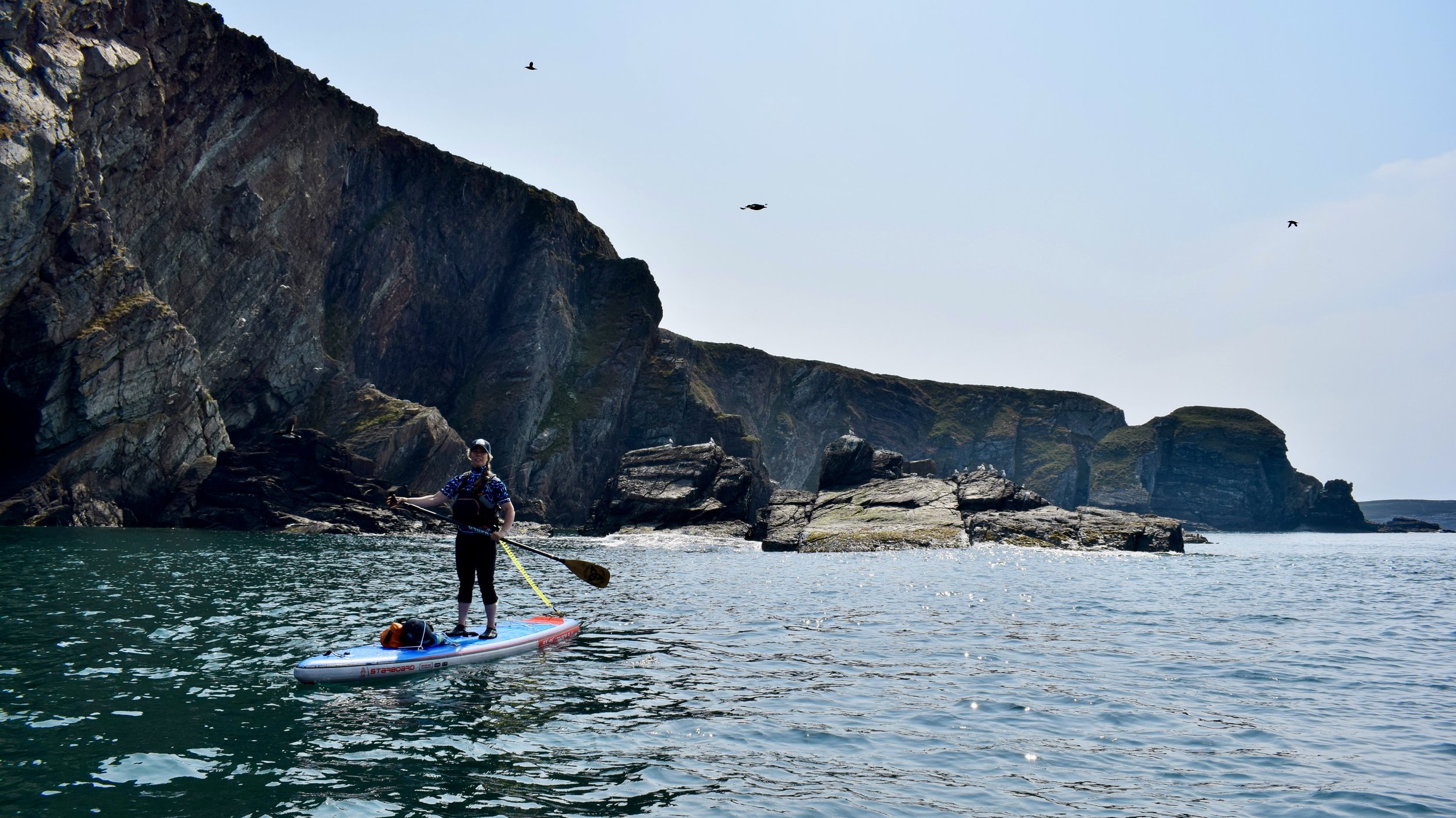 Good tidal planning was vital - a small tidal range and perfect timings allowed us to paddle onward towards the enormous walls of Main Cliff, where Anglesey’s deepest sea caves awaited. Checking for incoming swell from passing Irish ferries, we explored these dark labyrinths - familiar to us in kayaks, but a ‘personal first’ on our SUPs. With few landings along this exposed coastline - and no easy escape - the exciting commitment of this trip simply added to our feeling of adventure and challenge.