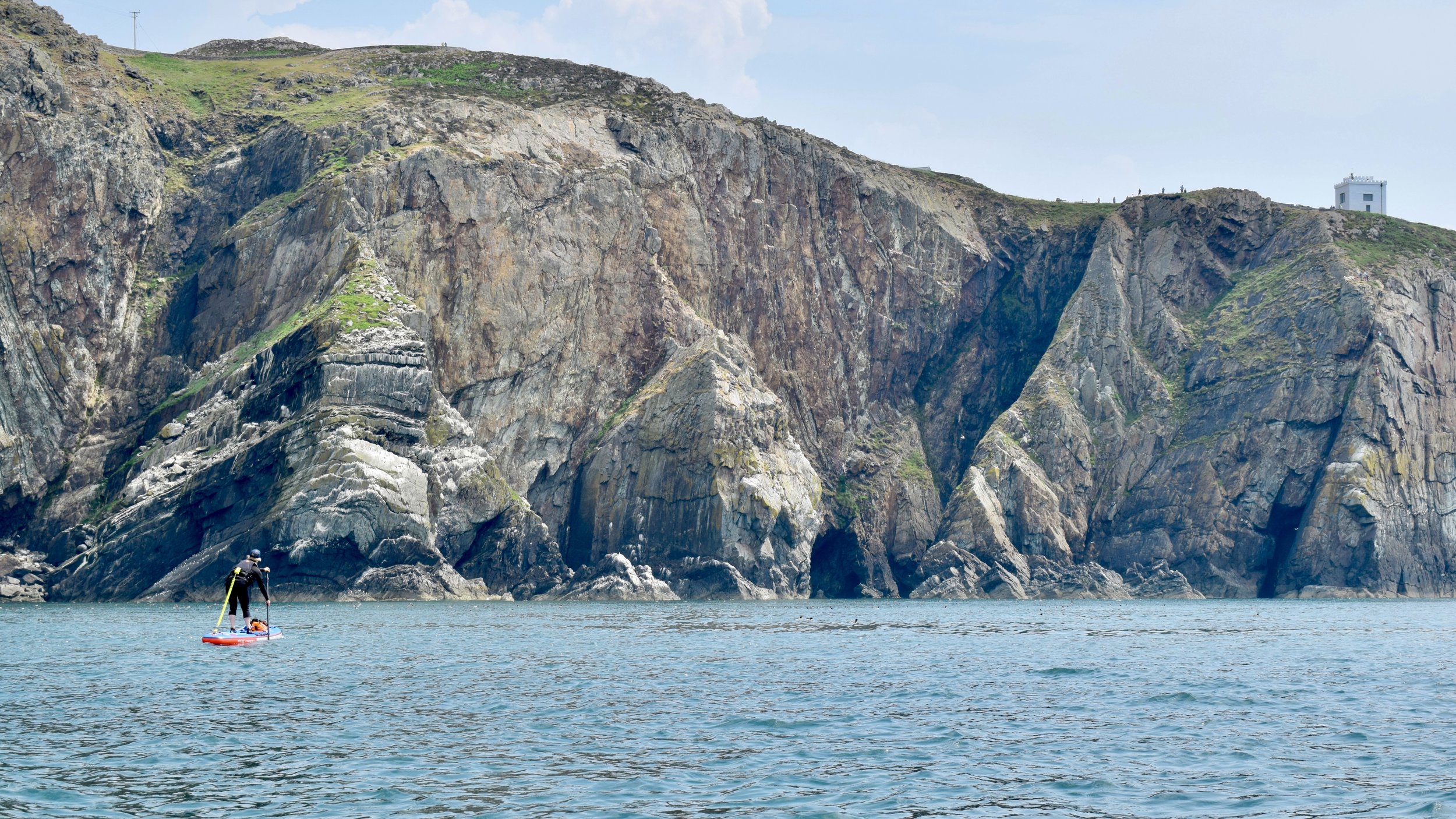 We arrived at North Stack and paddled into the stunning rock architecture of Parliament House Cave - this was the limit of today’s journey, the moment to retrace our paddle strokes before the increasing tide brought new challenges. We stopped to admire the view along the north side of the headland - at other times we encounter a powerful tide race here, but not today. We drifted a while, admiring Carmel Head’s distant headland and the low outline of the Skerries across Holyhead Bay - an enticing destination for future SUP adventures, perhaps?