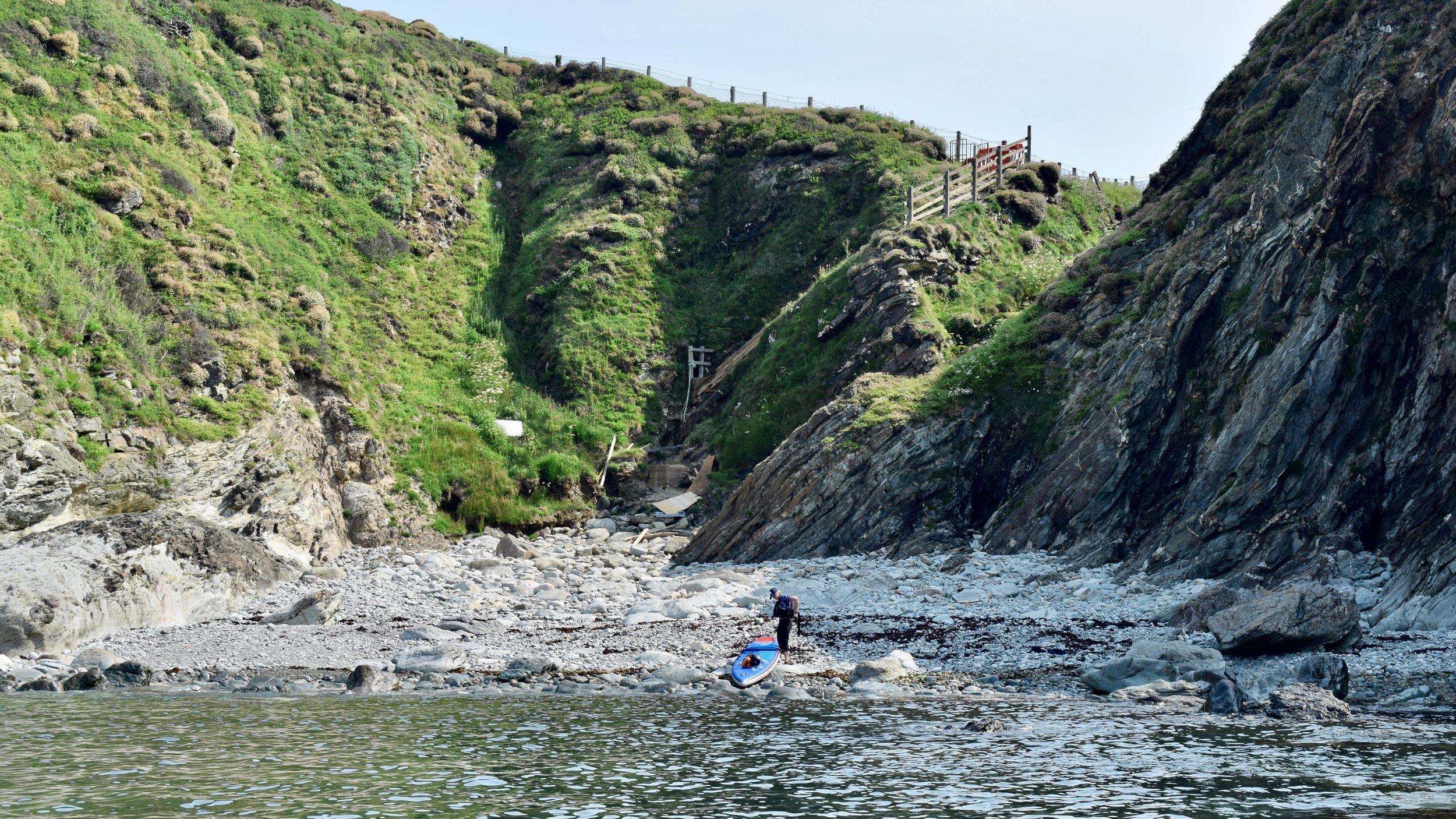We were seeking an ideal set of conditions - light winds and low sea state, combined with a small tidal range and ideal timings to allow us to avoid the tide races that make the outer coast of Holy Island so challenging and committing. Our chosen day arrived, bright summer sunshine warming us as we drove to a hidden access point 2km from South Stack - here we could inspect the conditions beneath the sea cliffs of Abrahams Bosom. Calm seas greeted our arrival - we were good to go! We hastened to prepare the kit and carefully carried our craft down an awkward narrow track to reach a small storm beach hemmed between steep rocky walls. Have SUPs, will travel!
